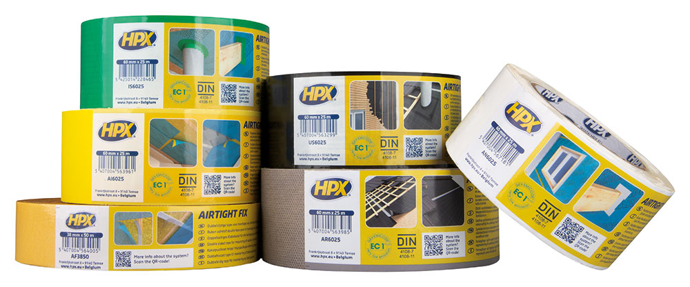 HPX Durable Airtight Products zijn een selectie van professionele, zelfklevende tapes voor het luchtdicht maken van woning en gebouw. Het systeem bevat producten voor zowel binnen- als buitengebruik, alsook moeilijk af te dichten plaatsen.